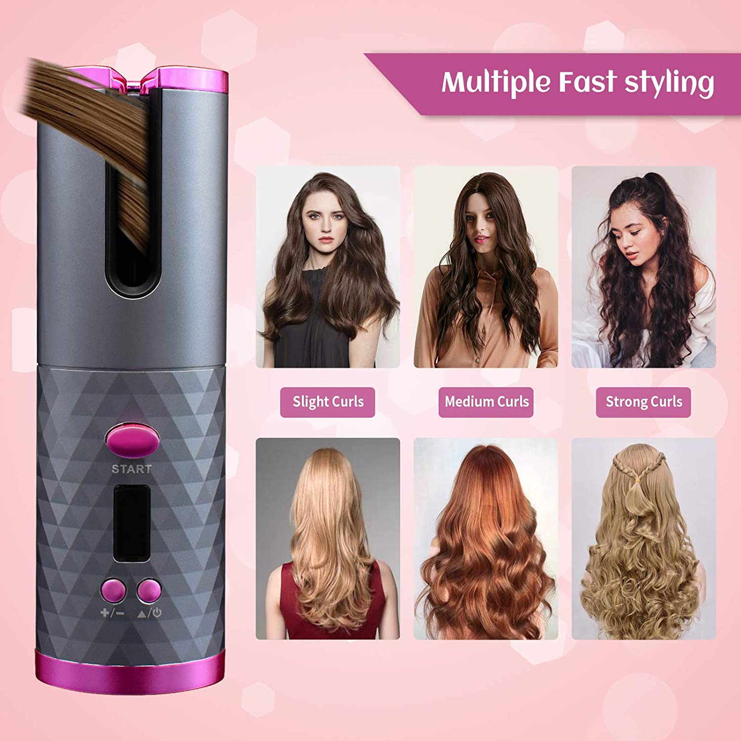 The Fashiongirl Cordless Automatic Hair Curler features a metallic gray, diamond-textured body with bright pink accents, side buttons, and a small digital display for effortless styling anywhere.